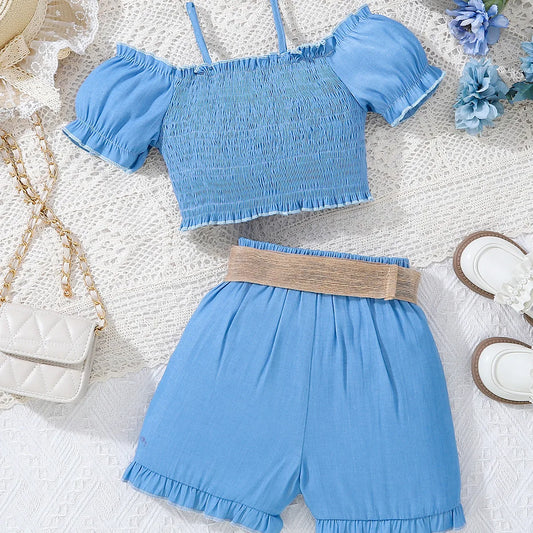 ๐๐ง Girls 3pc Blue Shorts Set with Matching Headband