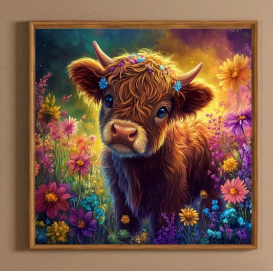 🐮✨ Highland Cow Diamond Painting With Multicoloured Flowers ✨🐮
