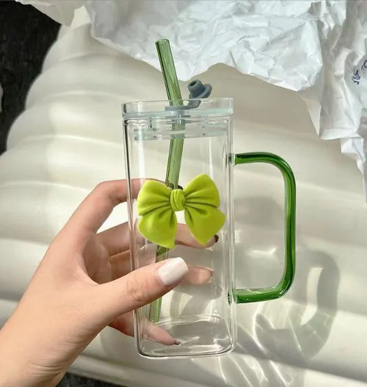 🎀✨ Glass Cup with 3D Bow Decal & Straw ✨🎀