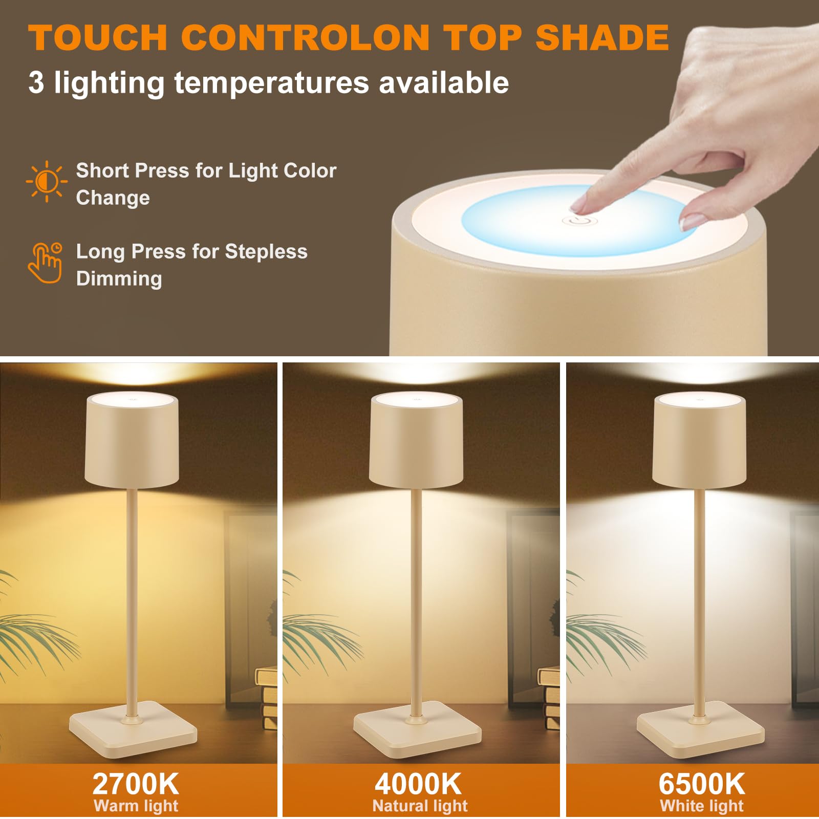 2 Pack Cordless Rechargeable LED Table Lamps, Waterproof Aluminium Touch Lights, Wireless Indoor & Outdoor Bedside Lighting - Sand