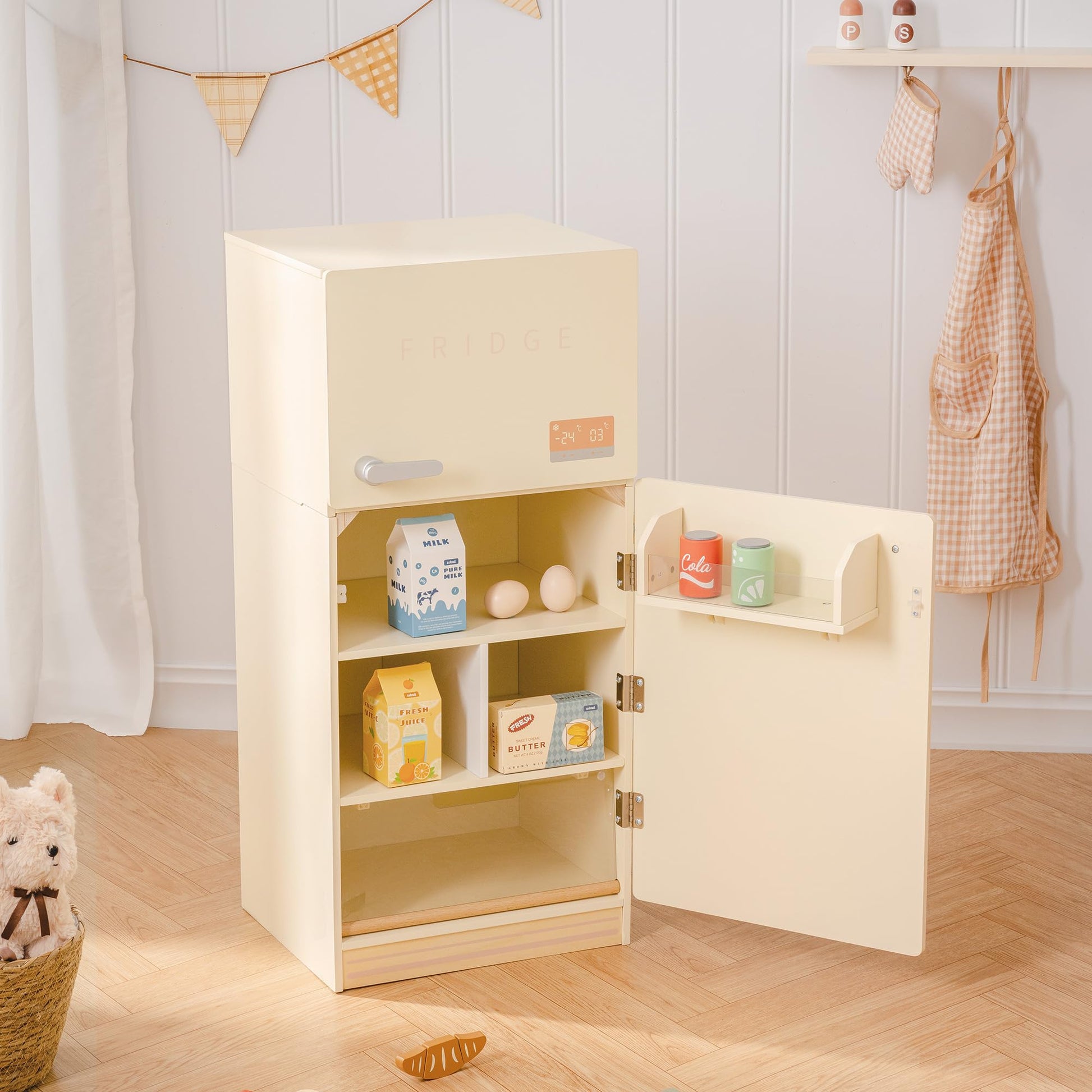 Wooden Toy Fridge Kids Play Kitchen Refrigerator Pretend Play Set with Accessories - Creamy Child-Size